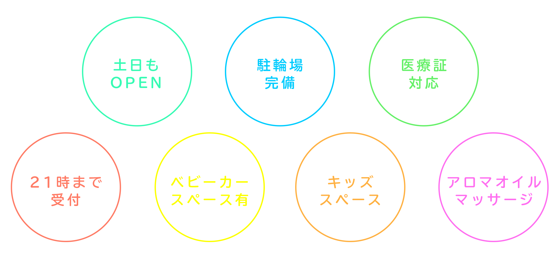 にじいろ整骨院は、誰でも気軽に立ち寄れる、街のかかりつけ整骨院を目指しています。お身体の不調に悩む方はもちろん、スポーツ中の怪我、お買い物ついでに、会社帰りに、ちょっと寄って身体と心の「健康補給」をしていきませんか?そんな「街のかかりつけ整骨院」を、私たちは本気で目指しています。